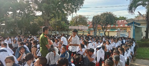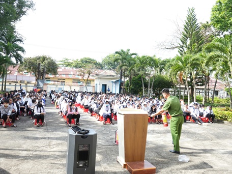 - Đồng chí Thượng úy Trần Văn Minh, cán bộ Phòng Cảnh sát phòng cháy chữa cháy tuyên truyền nội dung: Hướng dẫn sử dụng một số phương tiện chữa cháy thông dụng để xử lý các tình huống cháy nổ, nổ mới phát sinh; kỹ năng phòng cháy, chữa cháy và cách thoát nạn trường hợp cháy nổ, tai nạn, sự cố.