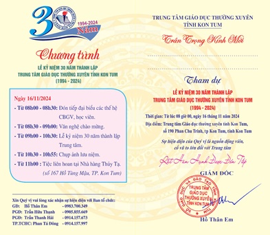 Sáng 16/11/2024, Trung tâm GDTX tỉnh Kon Tum kỷ niệm 30 năm hình thành và phát triển